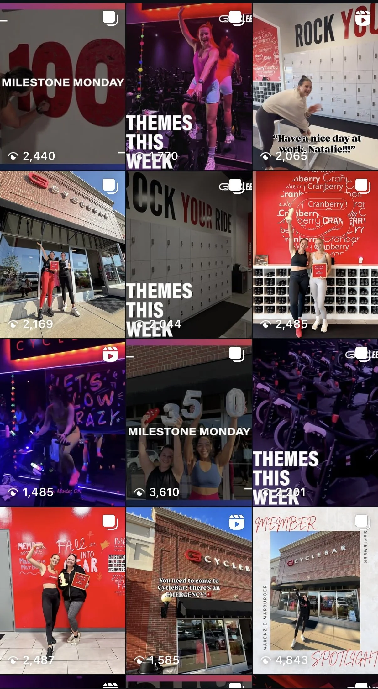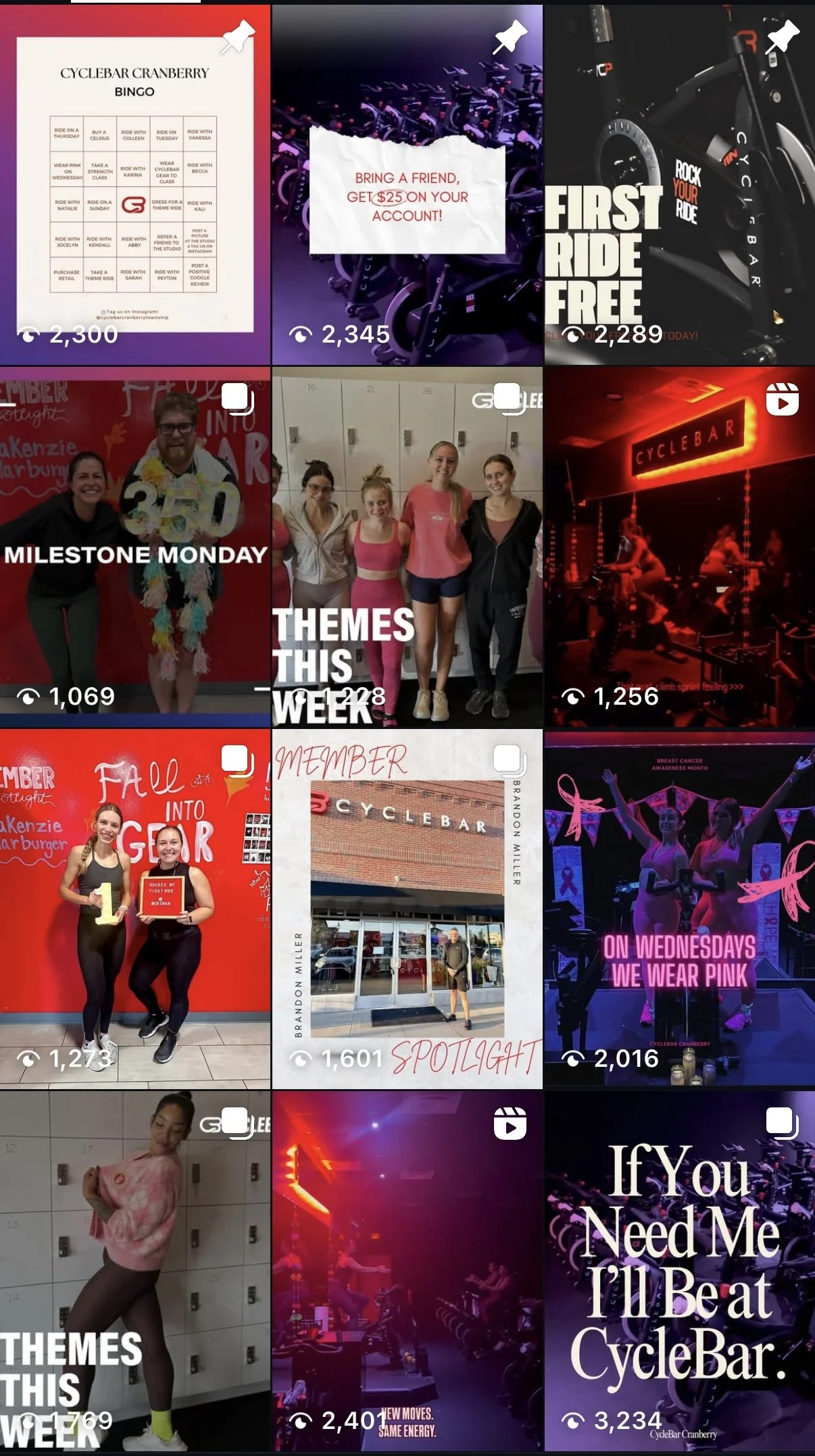 This collection highlights the Instagram content I’ve created for CycleBar Cranberry, where I manage the studio’s social media strategy and design. Each post is crafted to reflect the energy of our community, promote themed rides and special events, and celebrate member milestones. I focus on pairing eye-catching visuals with engaging captions that encourage interaction and brand loyalty. These posts consistently reach and engage our audience, averaging around 2,000 views per post, and serve as a key part of how we build connection both inside and outside the studio. You can explore more of my work on Instagram at @cyclebarcranberry